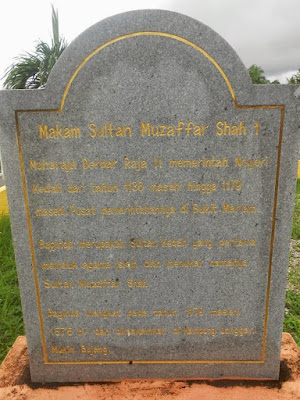 Masih lagi berkisar tempat besejarah. Kita akan ke Makan Sultan Muzaffar Shah I dan menurut Hikayat Merong Mahawangsa, Sultan Muzaffar Shah adalah sultan pertama yang memeluk Islam dan mangkat pada 13 Safar 175H bersamaan 1179M dan dimakamkan di Langgar Kora, Bukit Meriam . Baginda memeluk agama Islam melalui seorang alim dari Yaman iaitu Sheik Abdullah bin Sheik Ahmad bin Quamiri. Pada tahun 1179, Sultan Muzaffar Shah telah mangkat setelah baginda memerintah Kedah selama lebih kurang 43 tahun.